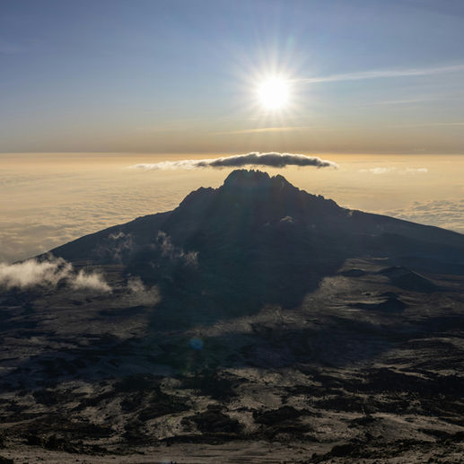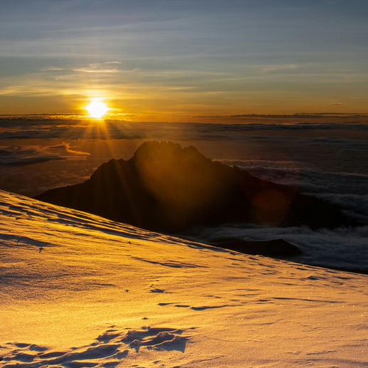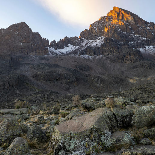 At sunrise, the glaciers glow gold and the vast plains of Tanzania stretch far below. After celebrating on the summit, we descend to Barafu for a short rest before continuing down to Mweka Camp.